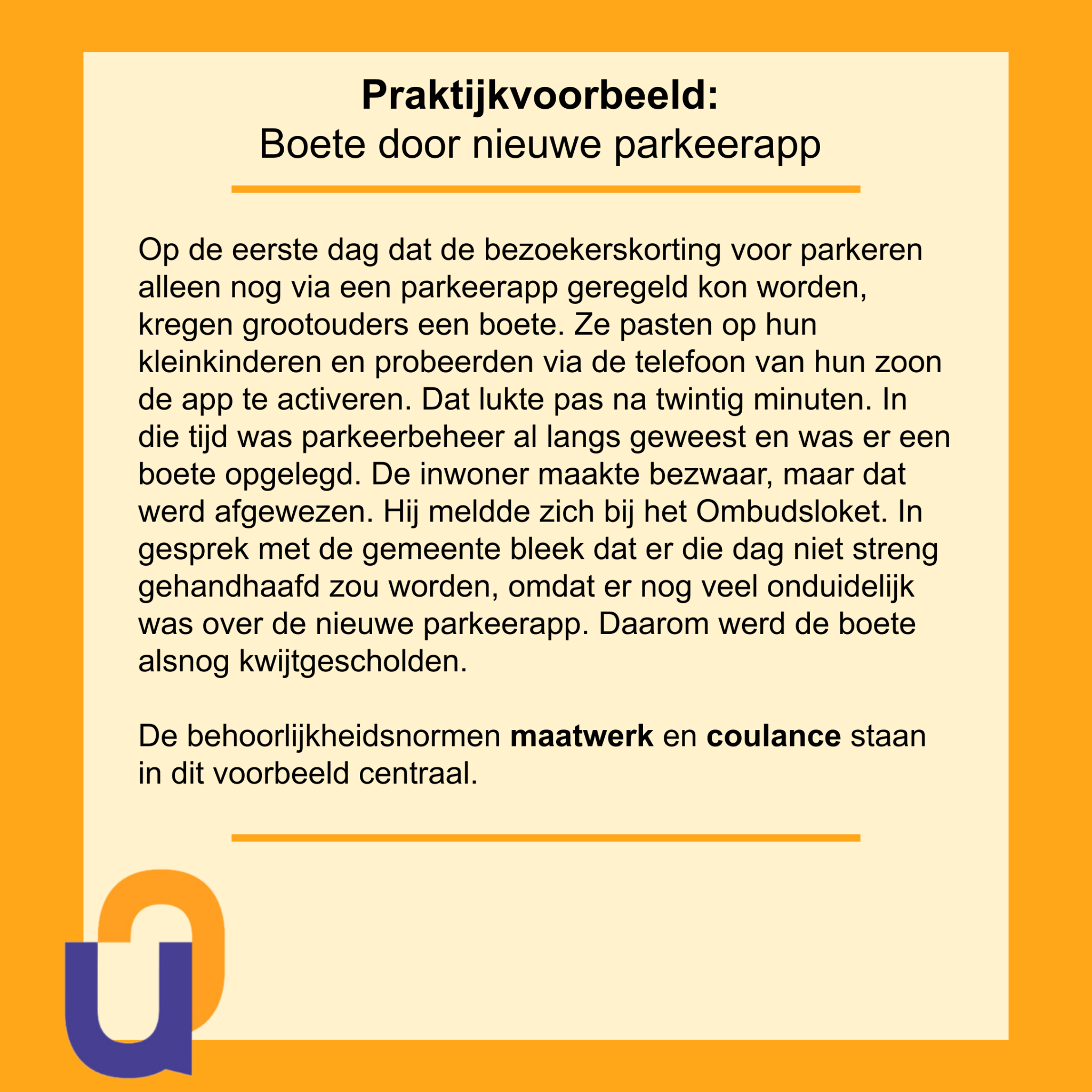 Klik hier voor een praktijkvoorbeeld bij deze behoorlijkheidsnormen over de kwijtschelding van een boete vanwege de nieuwe parkeerapp.