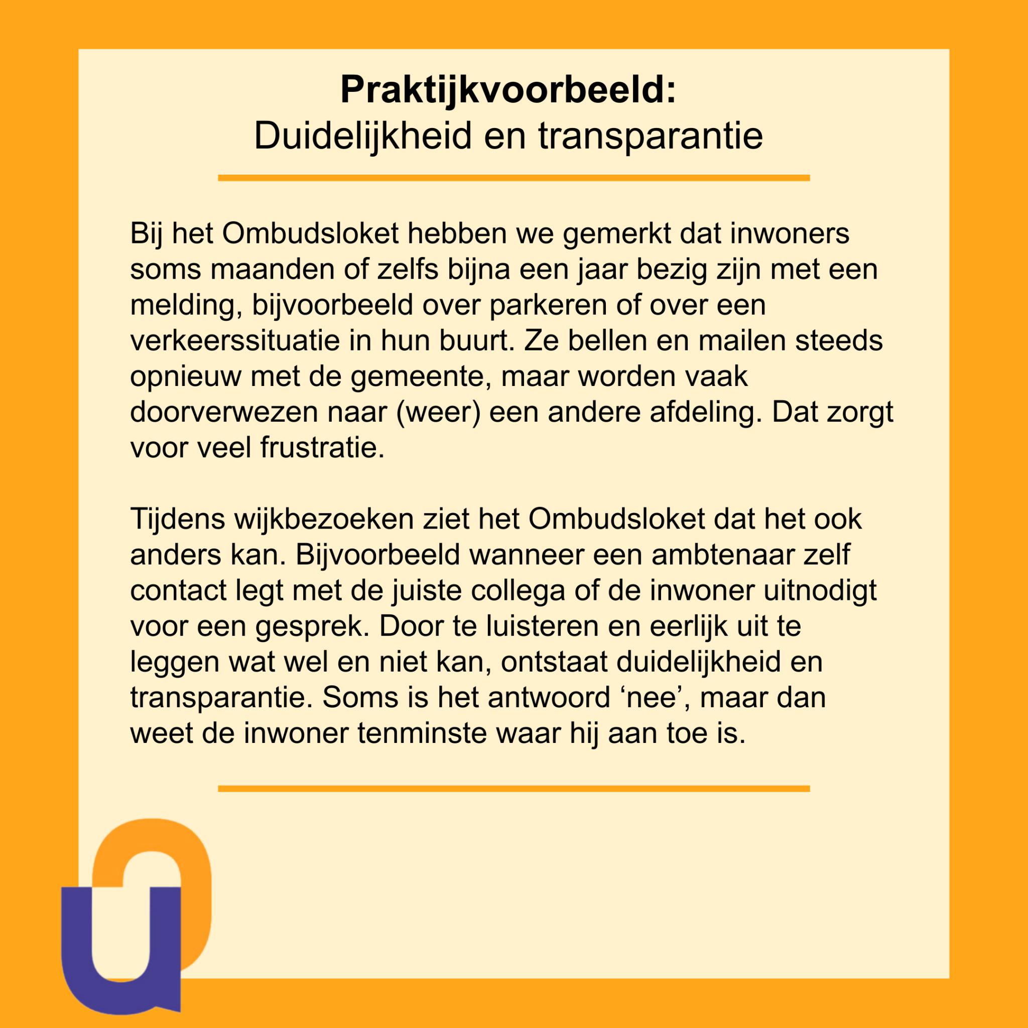 Tot slot is het belangrijk dat de gemeente haar werk zorgvuldig, neutraal en met goede bedoelingen doet. Belangrijke normen hierbij zijn integriteit, onpartijdigheid en transparantie. De gemeente moet open zijn over hoe beslissingen worden genomen en welke stappen inwoners kunnen zetten als ze het ergens niet mee eens zijn. Ook moet de gemeente eerlijk zijn over wat wel en niet mogelijk is. Eerlijkheid zorgt voor vertrouwen bij inwoners.