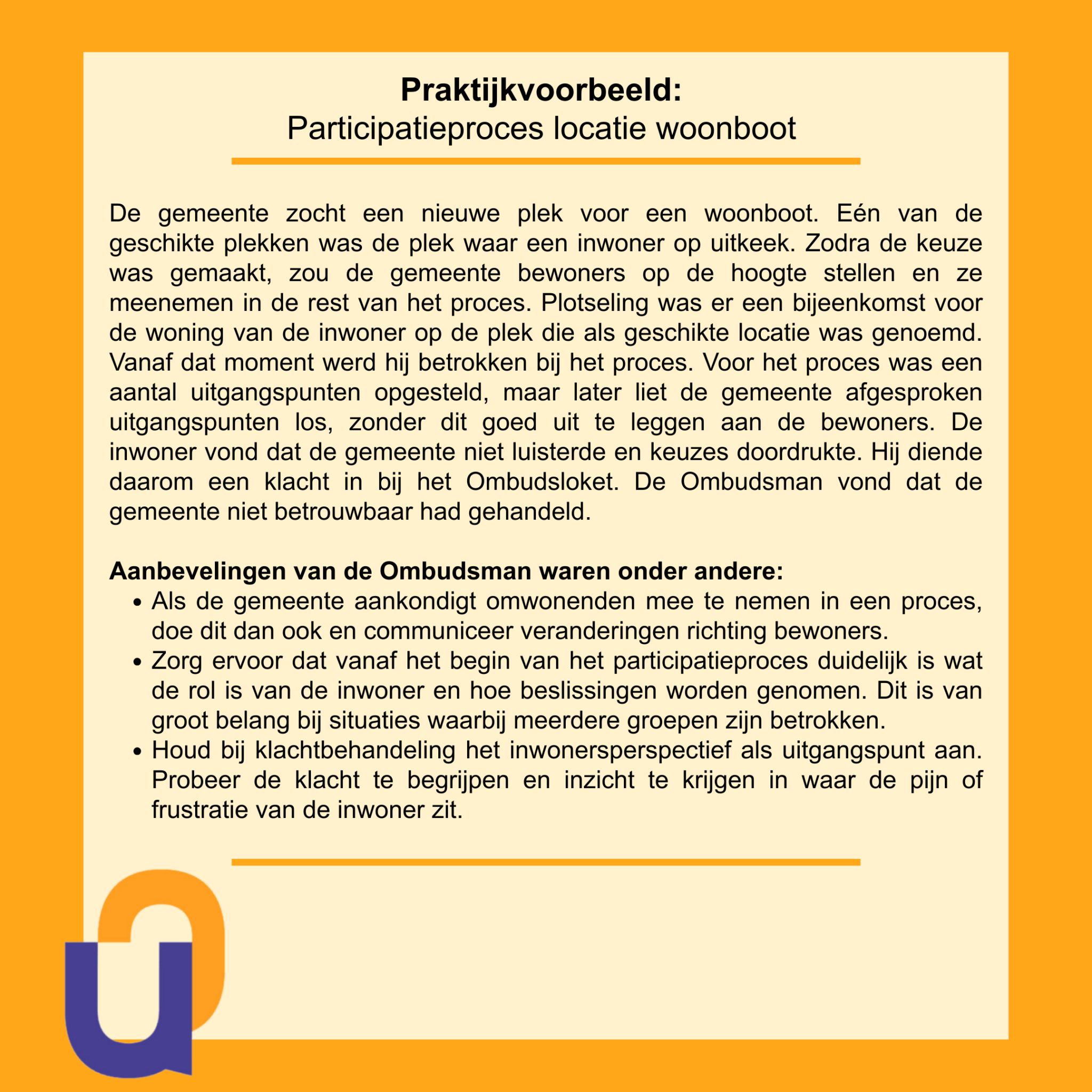 Klik hier voor een praktijkvoorbeeld bij deze behoorlijkheidsnormen over het participatieproces bij het bepalen van de locatie van een woonboot.
