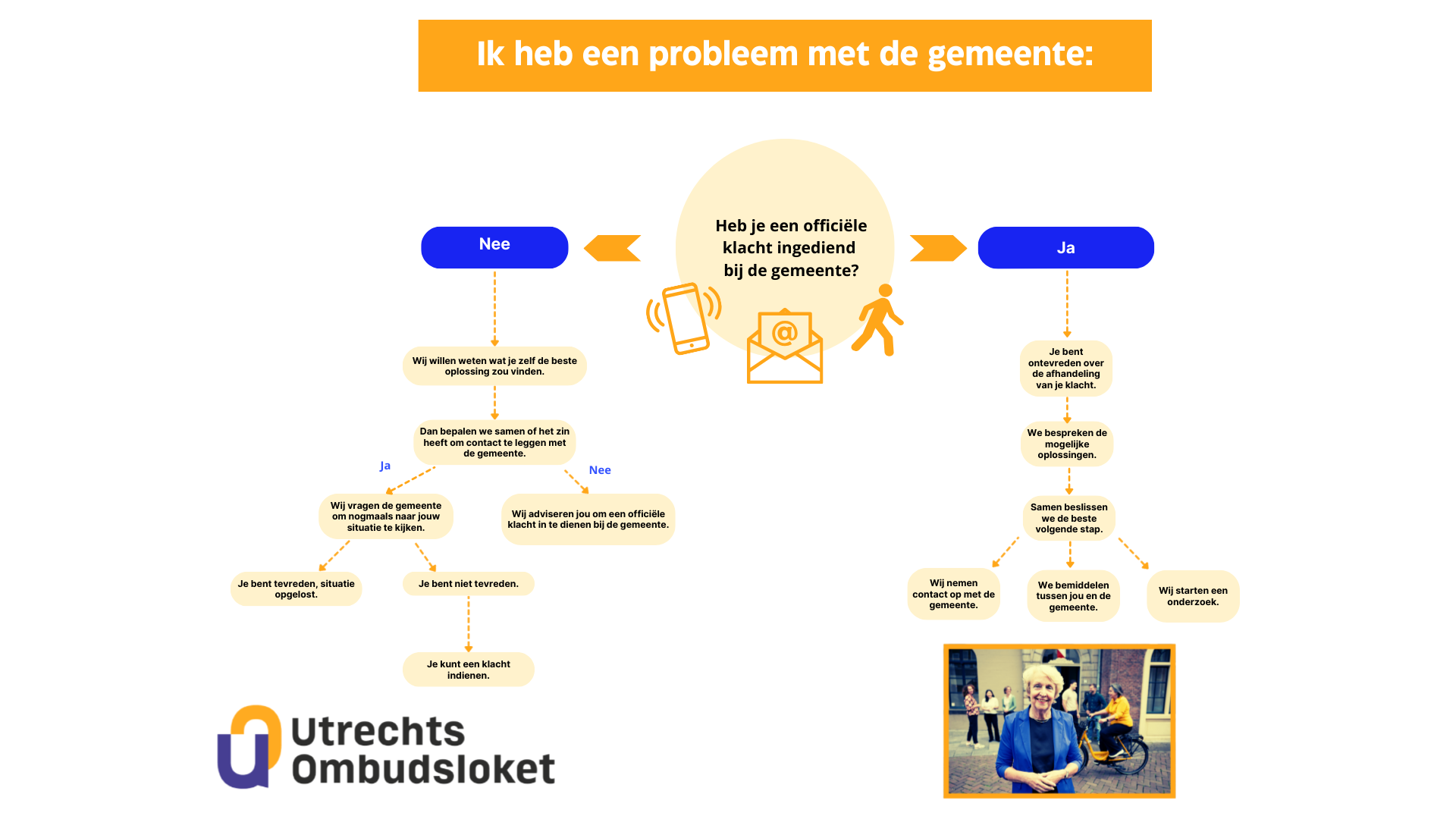 Het Ombudsloket kan je daarom adviseren om een klacht in te dienen bij de gemeente zelf. Je volgt dan eerst de klachtenprocedure van de gemeente Utrecht. Ben je daarna niet tevreden over de manier waarop je klacht is afgehandeld of duurt het langer dan zes weken voordat je een antwoord op je klacht krijgt? Neem dan opnieuw contact met ons op.